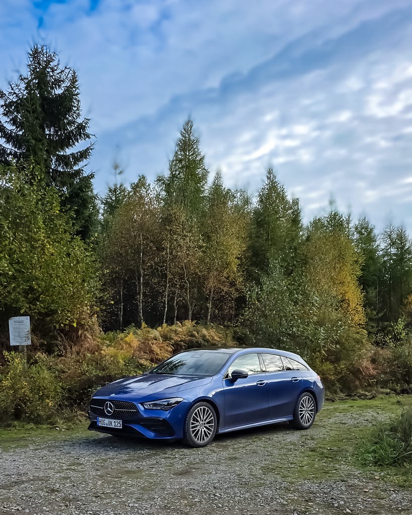 Der Mercedes-Benz CLA Shooting Brake präsentiert sich in dieser Aufnahme in einer ruhigen Naturkulisse, umgeben von dichten Bäumen und herbstlicher Vegetation. Die elegante Linienführung, die flache Silhouette und die markante Front unterstreichen den sportlich-dynamischen Charakter dieses Premium-Kombis. Der tiefblaue Lack harmoniert mit der natürlichen Umgebung und betont das moderne Design sowie die Balance zwischen Alltagstauglichkeit und sportlicher Präsenz. Dieses Motiv zeigt den CLA Shooting Brake als stilvollen Begleiter für jede Fahrt – von urbanen Straßen bis hin zu abgelegenen Landschaften.