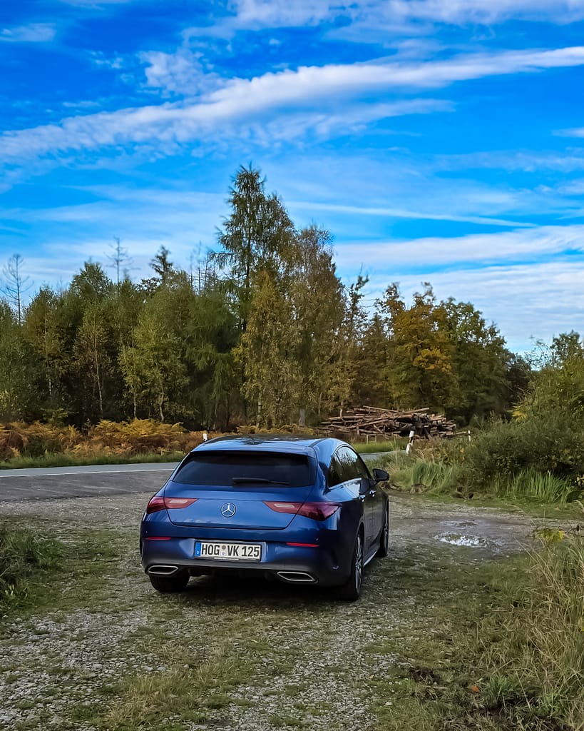 Der Mercedes-Benz CLA Shooting Brake steht am Rand eines ruhigen Waldwegs, umgeben von herbstlicher Natur. Die klare Linienführung des Fahrzeugs trifft auf kräftige Farben des Himmels und der Bäume und unterstreicht den sportlich-eleganten Charakter des Modells in einer natürlichen Umgebung.