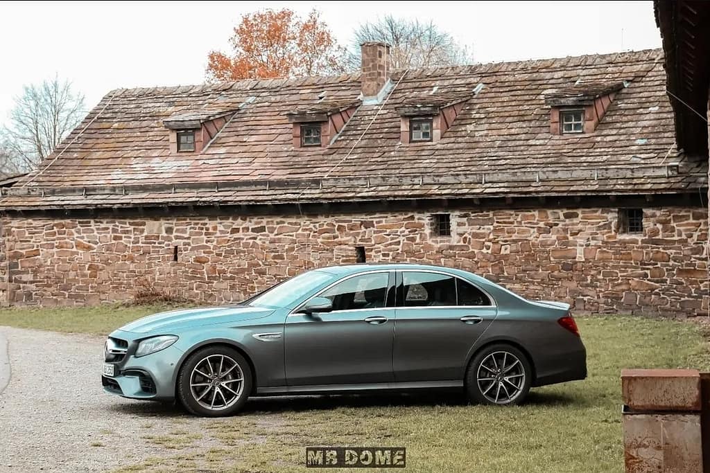 Der Mercedes-AMG E 63 steht in dieser Aufnahme in einer ruhigen, ländlichen Umgebung vor einem historischen Natursteingebäude mit traditionellem Ziegeldach. Die elegante Seitenansicht betont die gestreckte Silhouette, die kraftvollen Proportionen und die sportlichen AMG-Leichtmetallräder. Die besondere Lackierung mit ihrem edlen Farbverlauf verleiht der Limousine eine exklusive und moderne Ausstrahlung, die einen spannenden Kontrast zur rustikalen Architektur im Hintergrund bildet. Das Zusammenspiel aus Tradition und High-Performance-Design unterstreicht den luxuriösen Charakter dieses Fahrzeugs.