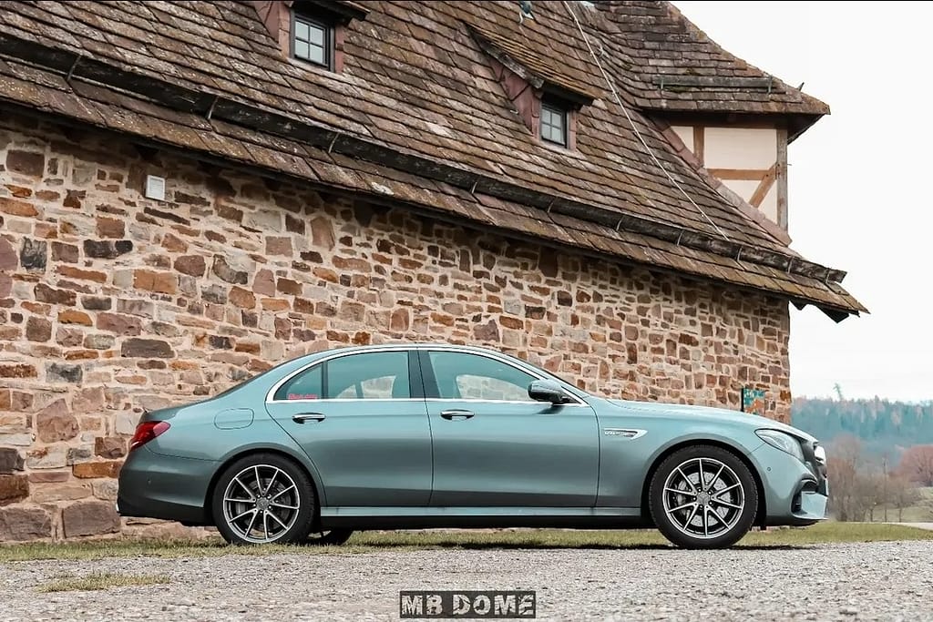 Der Mercedes-AMG E 63 steht in dieser Aufnahme in einer ruhigen, ländlichen Umgebung vor einem historischen Natursteingebäude mit traditionellem Ziegeldach. Die elegante Seitenansicht betont die gestreckte Silhouette, die kraftvollen Proportionen und die sportlichen AMG-Leichtmetallräder. Die besondere Lackierung mit ihrem edlen Farbverlauf verleiht der Limousine eine exklusive und moderne Ausstrahlung, die einen spannenden Kontrast zur rustikalen Architektur im Hintergrund bildet. Das Zusammenspiel aus Tradition und High-Performance-Design unterstreicht den luxuriösen Charakter dieses Fahrzeugs.
