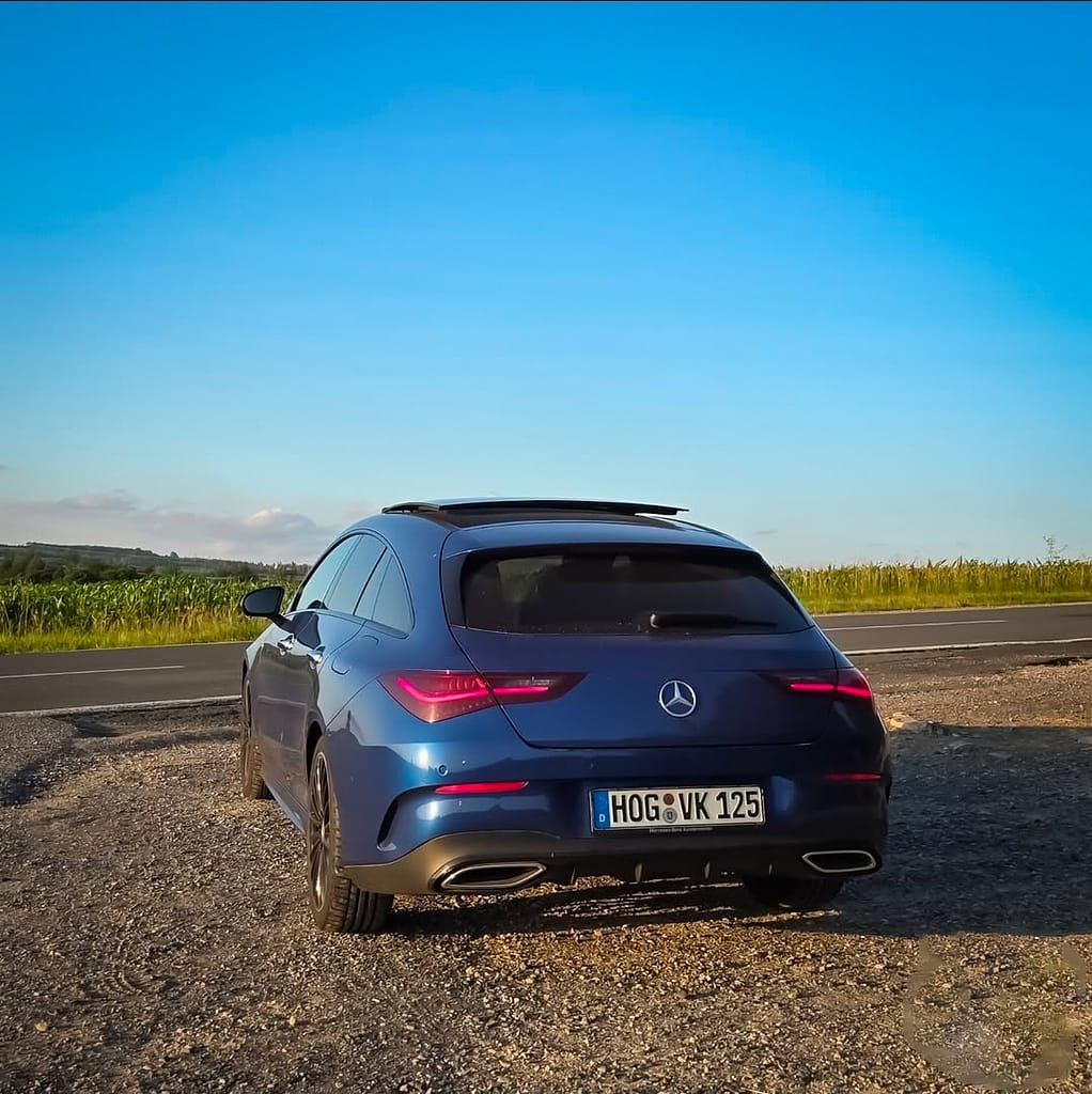 Die Heckansicht des Mercedes-Benz CLA Shooting Brake zeigt die elegante Linienführung und das moderne Lichtdesign in einer ruhigen Abendstimmung. Das tiefe Blau des Fahrzeugs harmoniert mit der natürlichen Umgebung und dem klaren Himmel, während die schlanken LED-Rückleuchten den progressiven Charakter des Shooting Brake betonen. Die Aufnahme unterstreicht die gelungene Verbindung aus Funktionalität, Design und sportlicher Präsenz.